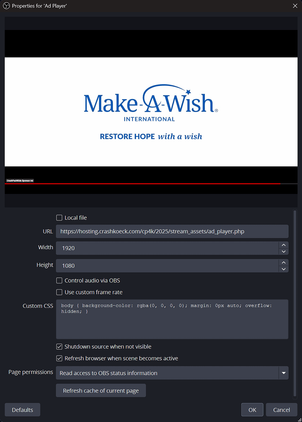 STEP 2: Create a Browser Source in any scenes where you want to have the Sponsor Ad Player and paste the address in the URL box. NOTE: This browser source should be UNDER your CrashPad4Kids overlay browser source.